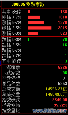 市场共5226只个股上涨,138只个股涨停,96只个股下跌。
